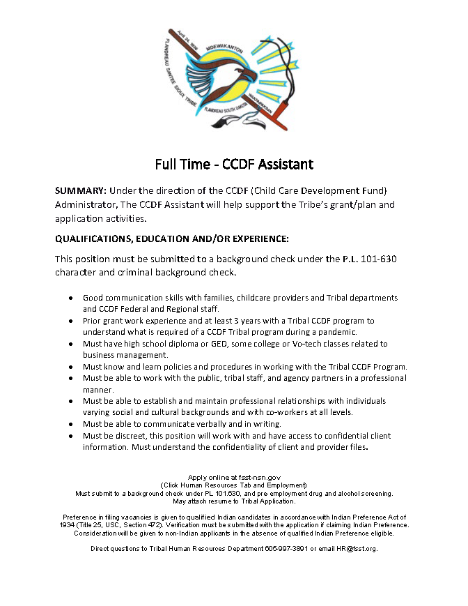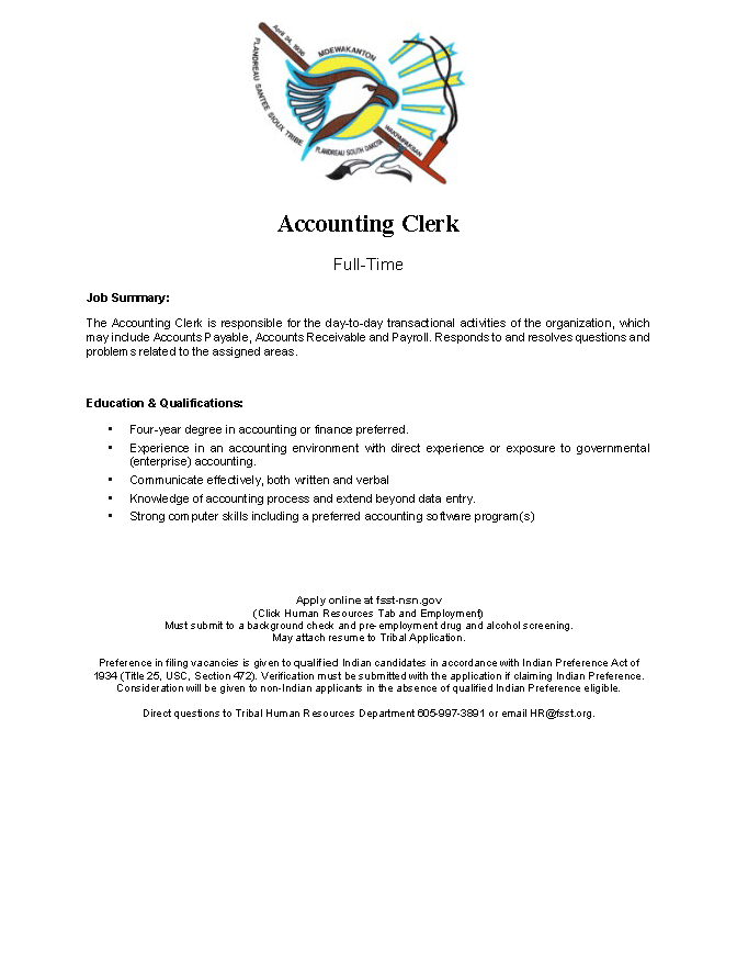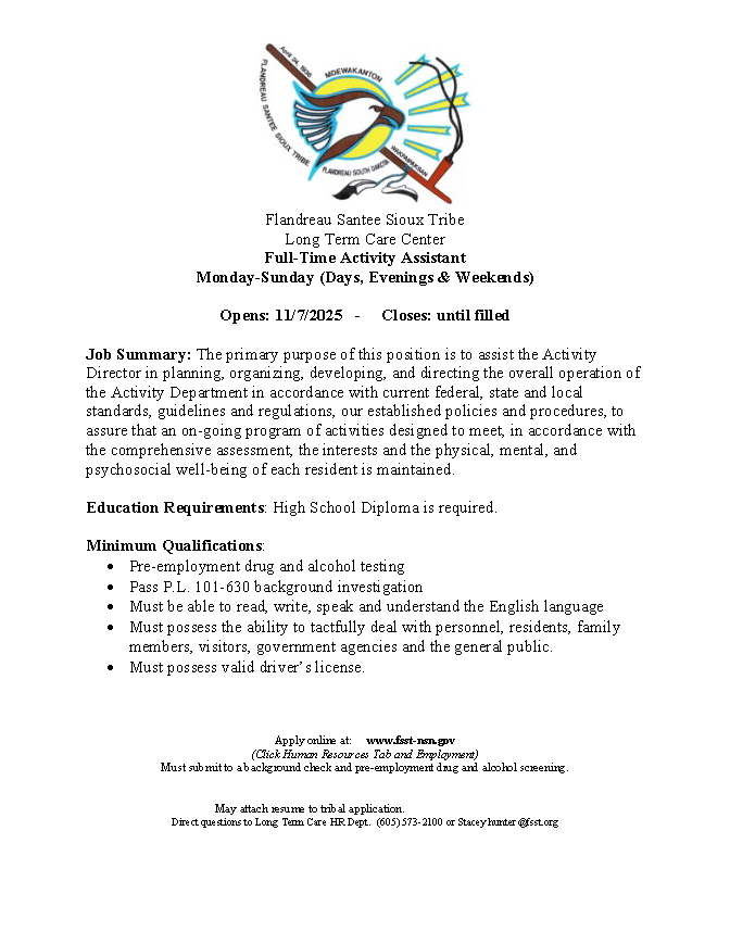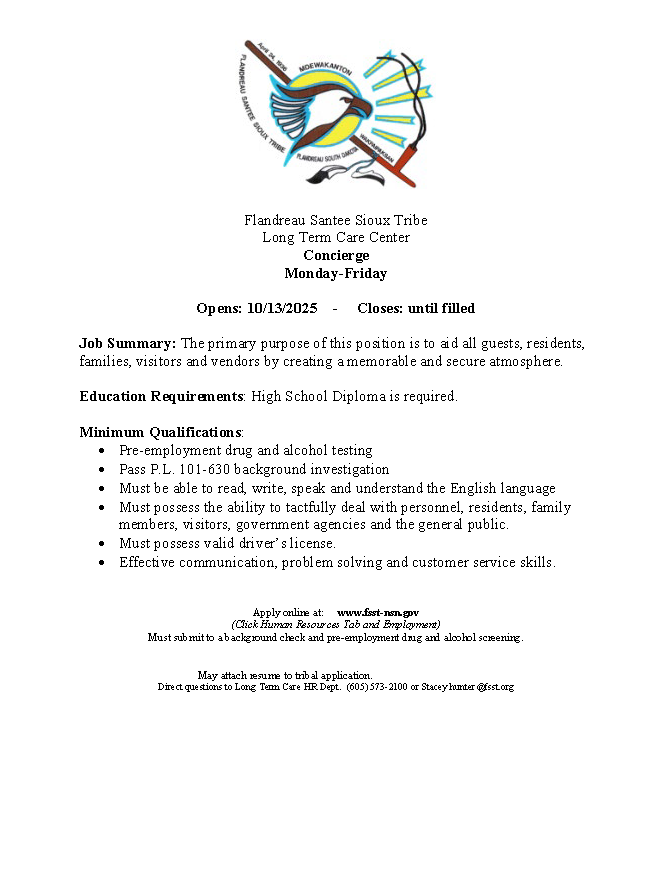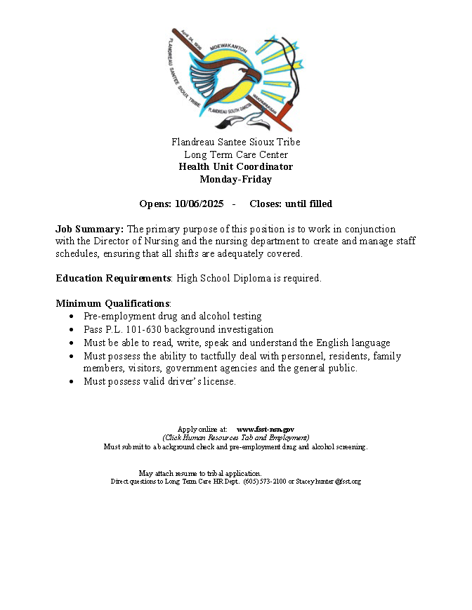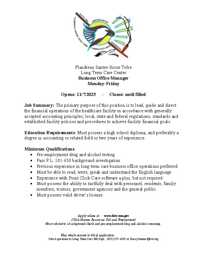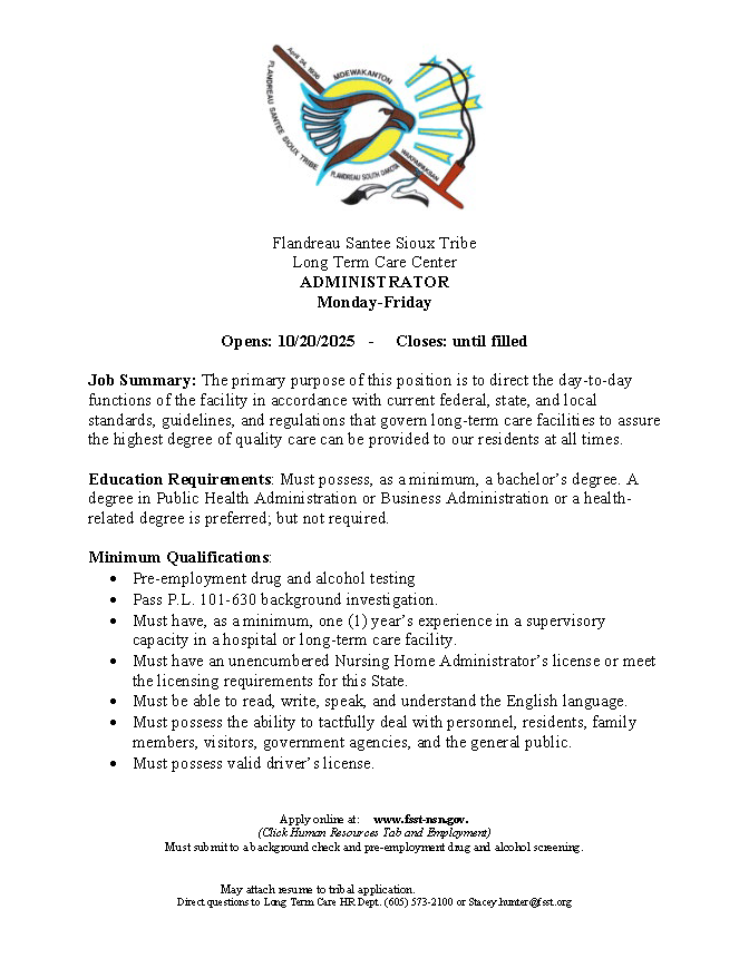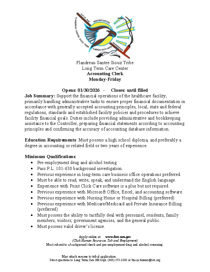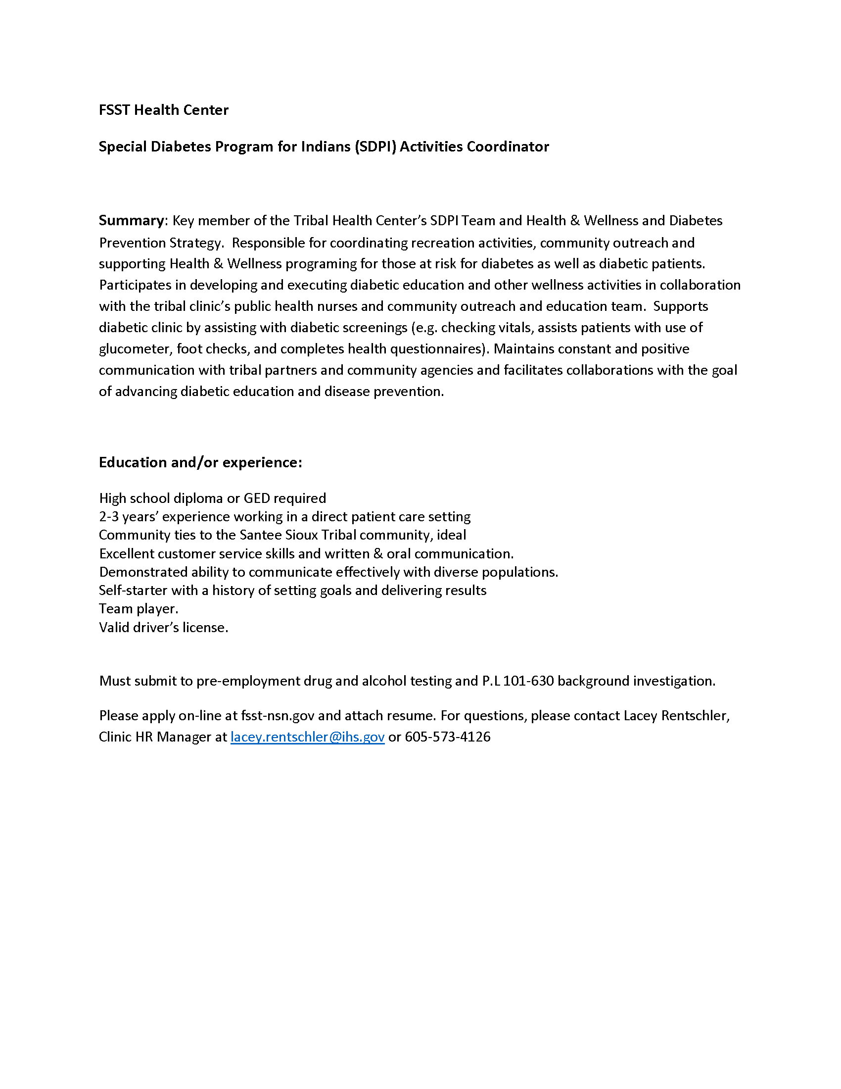 Please apply on-line at fsst-nsn.gov and attach resume. For questions, please contact Lacey Rentschler, Clinic HR Manager at lacey.rentschler@ihs.gov or 605-573-4126, or Cynthia Jacobs CEO at Cynthia.Jacobs@ihs.gov or 605-997-2642.