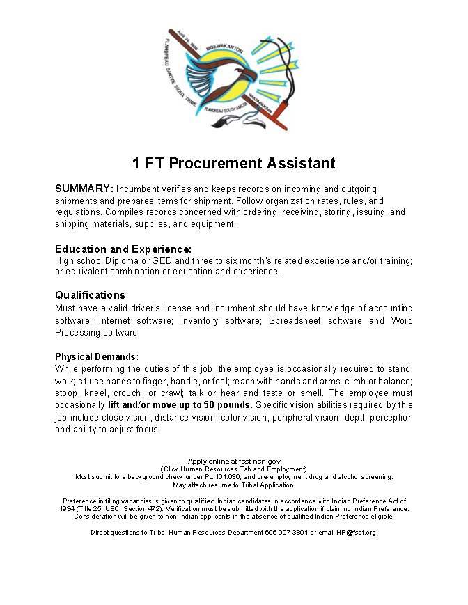 Preference in filing vacancies is given to qualified Indian candidates in accordance with Indian Preference Act of 1934 (Title 25, USC, Section 472). Verification must be submitted with the application if claiming Indian Preference. Consideration will be given to non-Indian applicants in the absence of qualified Indian Preference eligible.